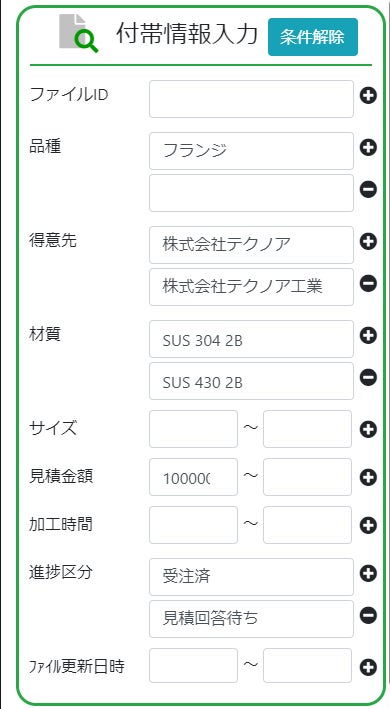 図面検索の際に抽出対象を絞り込むための検索項目を、お客様が自由に設定できるように、検索機能を強化しました。これにより柔軟かつ効率的な情報抽出が可能となります。