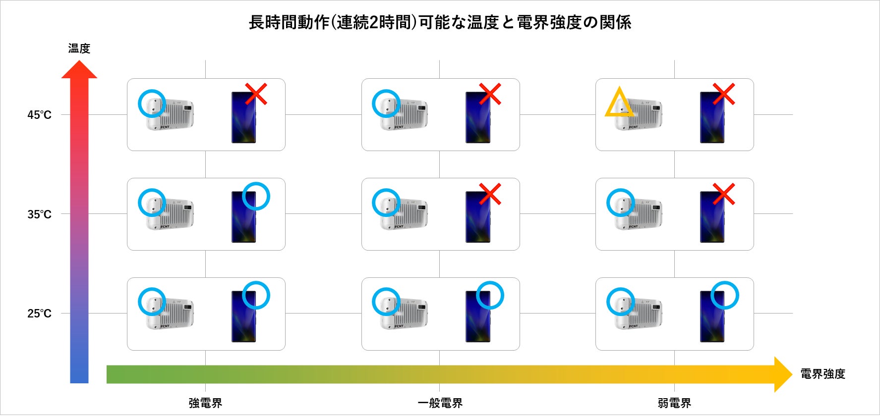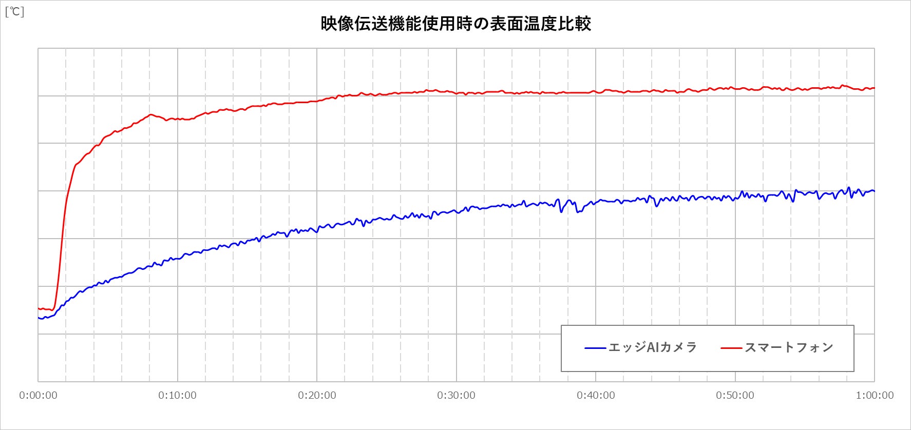 エッジAIカメラは独自の放熱構造により、通常のスマートフォンでは実現が難しい、気温35度以上の過酷な高温環境下でも、長時間の安定した映像伝送が可能です(注3)。