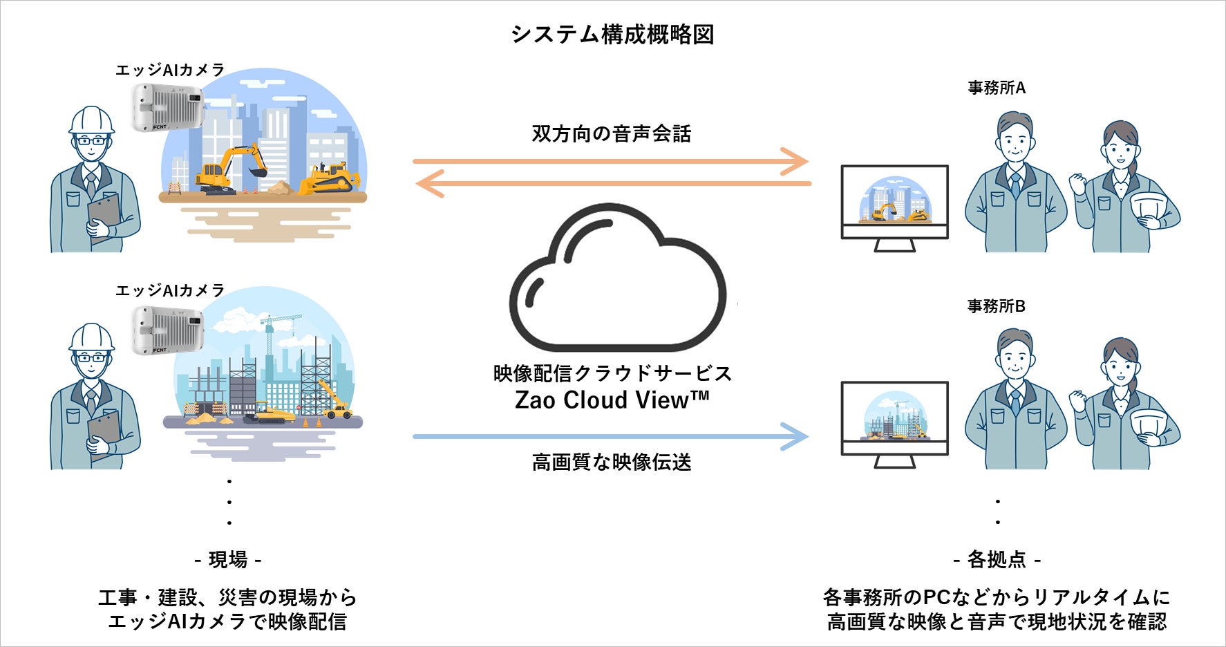 このような課題に対し、独自の放熱構造と防水防塵対応と、可搬性や設置・撤去の自由度が高いFCNTの「エッジAIカメラ」を、ソリトンシステムズが提供する「Zao Cloud View™」の映像配信デバイスとして使用することで、工事・建設現場や災害現場などに代表される高温かつ屋外の過酷な環境下でも長時間、安定した映像伝送を実現することが可能となりました。