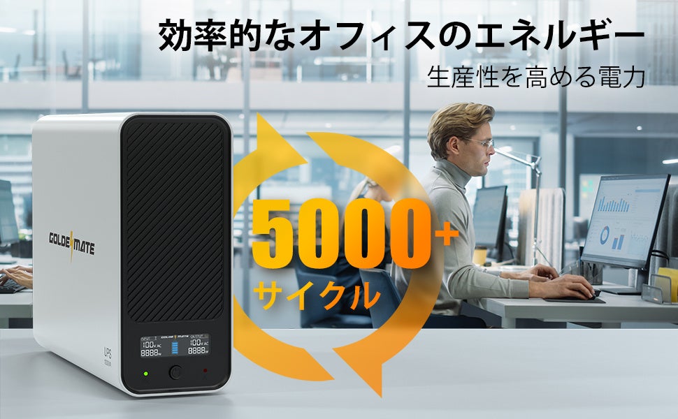 軽量で耐久性のあるリチウム鉄リン酸(LiFePO4)バッテリーパックを装備したGOLDENMATE UPSは、5000サイクル以上耐久します。これにより、従来の鉛酸バッテリーと比較して総所有コスト(TCO)を40%以上削減します。