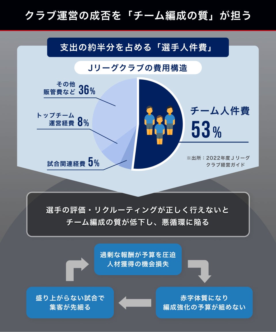 しかし資金供給が活発に行われている一方で、世界のスポーツクラブの多くが慢性的な赤字体質に陥っている現状があります。クラブ運営の支出で大きな割合を占めるのが選手の人件費ですが、選手の評価やリクルーティングでは「経験」や「直感」が重視され、チーム強化につながらない選手を獲得したり、過剰な獲得予算を組んでしまったりする非効率な経営が行われているクラブもあります。