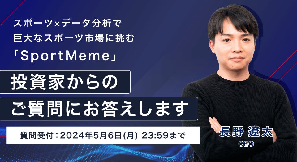 2024年5月6日(月)まで、「SportMeme」へのご質問を受け付けます。投資家の皆さまから頂いたご質問へのお答えを、5月9日(木)を目途に募集ページ( https://ecrowd.co.jp/projects/35 )へ掲載する予定です。
