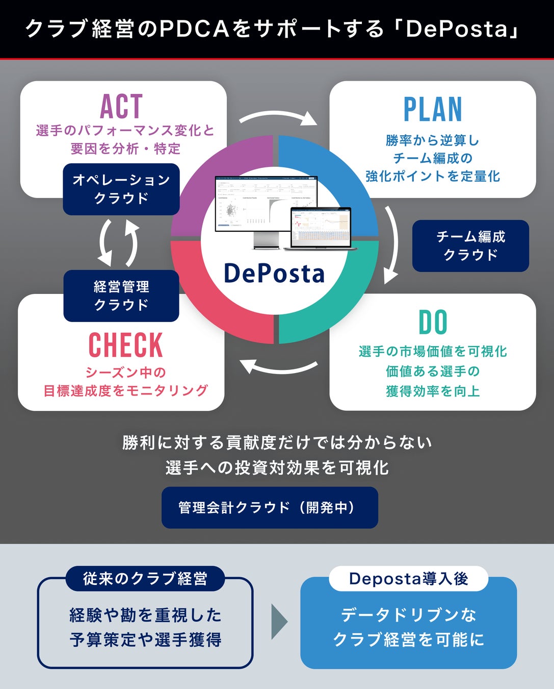 「DePosta」は選手のパフォーマンスを可視化する「チーム編成クラウド」を中心に、「経営管理クラウド」や「オペレーションクラウド」などの追加機能を利用することで、スポーツクラブ経営のPDCAサイクルをサポートします。