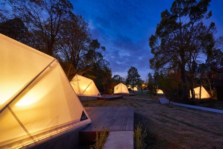 自然に囲まれた上質な宿泊体験ができる「テントキャビン」、アウトドアリビングと、アウトドアダイニングで森の四季を満喫できる「テラスハウス」、長期滞在にもおすすめの「テラスハウスプレミアム」ほか、ご宿泊の方のみご利用可能な露天風呂付き天然温泉「紅葉乃湯」や焚火ガーデン、ハンモックガーデンなどでお楽しみいただけます。