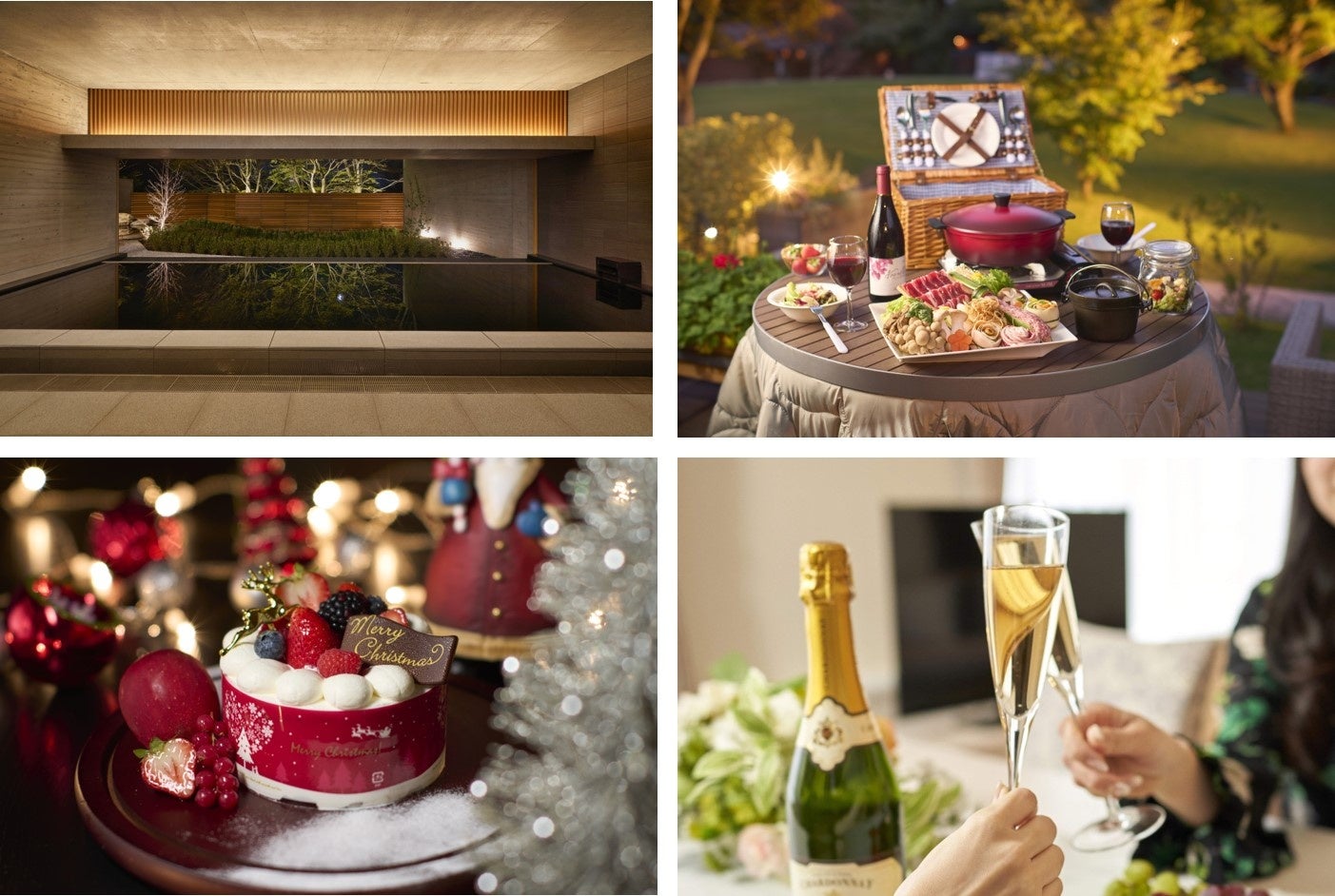 「Xmas限定プラン」では、グランピングテント「テントキャビン」、またはアウトドアリビングとアウトドアダイニングで自然を満喫できる「テラスハウス」にご宿泊いただけます。全室暖房付きで冬でも温かくお過ごしいただけるほか、天然温泉「紅葉乃湯」もご利用いただけます。お食事は、レストラン「翠州亭」での洋会席コースかプライベートテラスのコタツで味わう房総鍋どちらかをお選びいただけます。