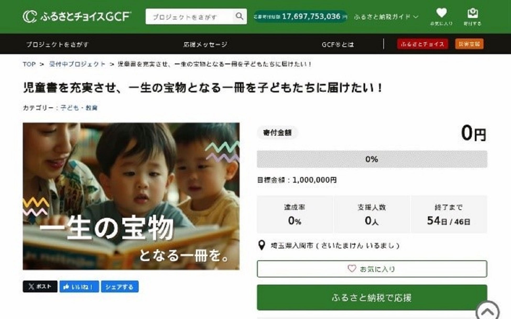 埼玉県入間市(市長:杉島理一郎、以下「入間市」)は、ふるさと納税総合サイト「ふるさとチョイス」を企画・運営する株式会社トラストバンク(本社:東京都渋谷区、代表取締役:川村憲一、以下「トラストバンク」)が提供するクラウドファンディング型ふるさと納税制度を活用して、入間市の未来の子どもたちに“一生の宝物になるような一冊に出合ってほしい”という想いから、入間市立図書館の児童書を購入するため、寄附を募るプロジェクトを開始します。