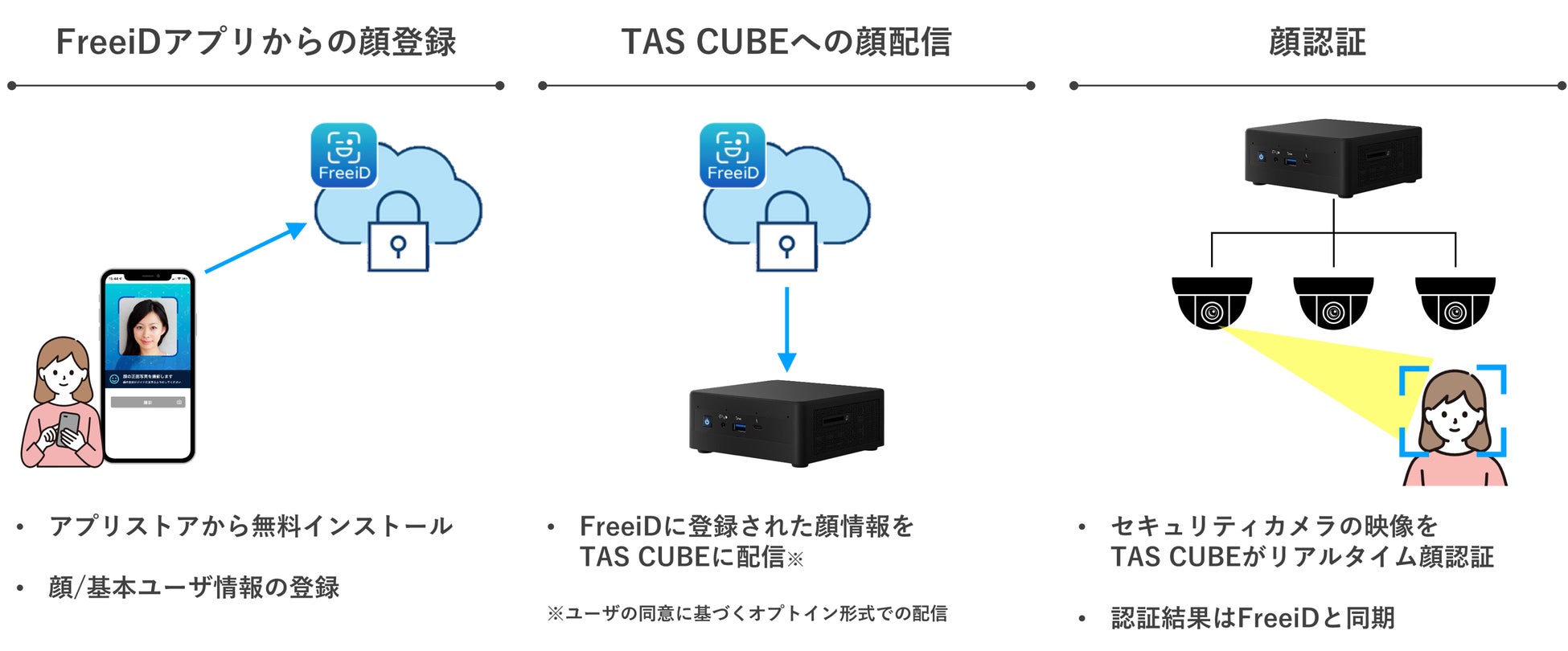従来、「FreeiD」の導入時には、顔認証端末や汎用タブレットなどカメラの新規設置が必要でしたが、「TAS CUBE」との連携により、日本国内に設置されている約100万台※1の既設のセキュリティカメラで「FreeiD」が利用可能になりました。