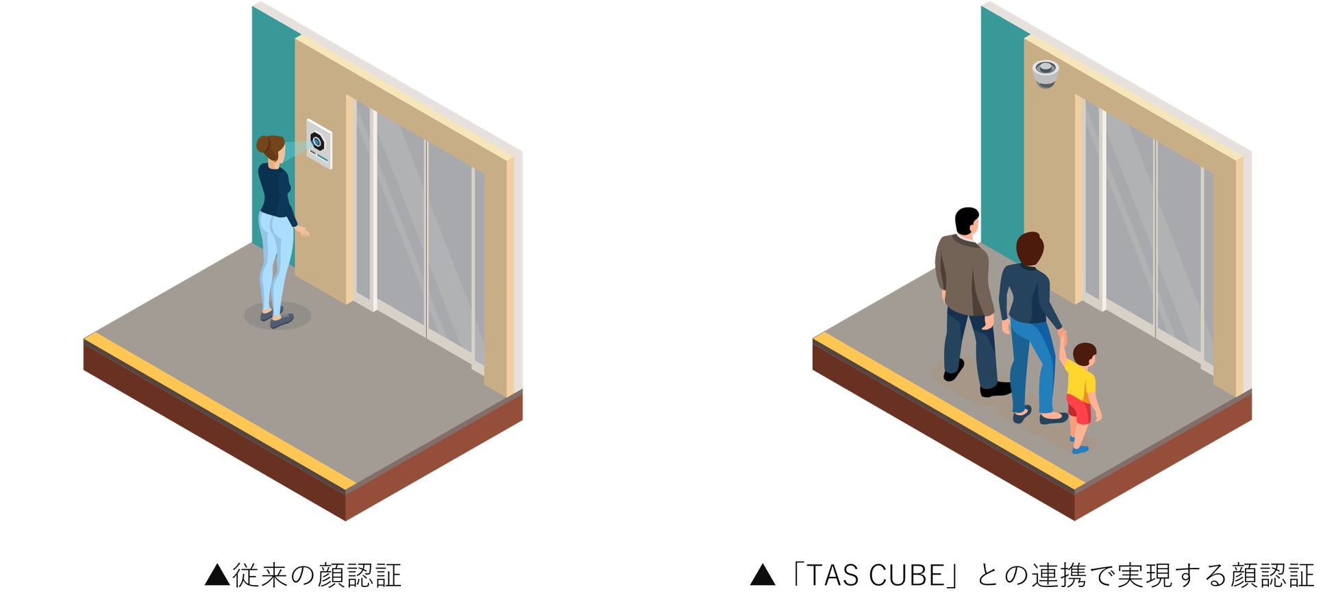 従来、「FreeiD」をマンションやオフィスなどで提供する際には、目線の高さに合わせた顔認証機器の設置を推奨しておりました。「TAS CUBE」との連携でセキュリティカメラが利用可能になることで、目線の高さにカメラを設置する必要がなくなり、設置の自由度と意匠性が向上します。