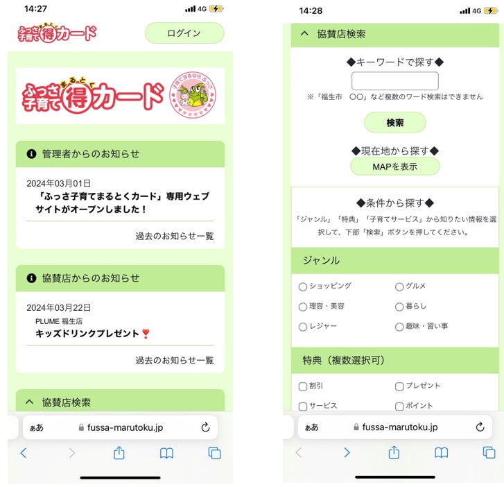 ▼「ふっさ子育てまるとくカード」専用Webサイト画面