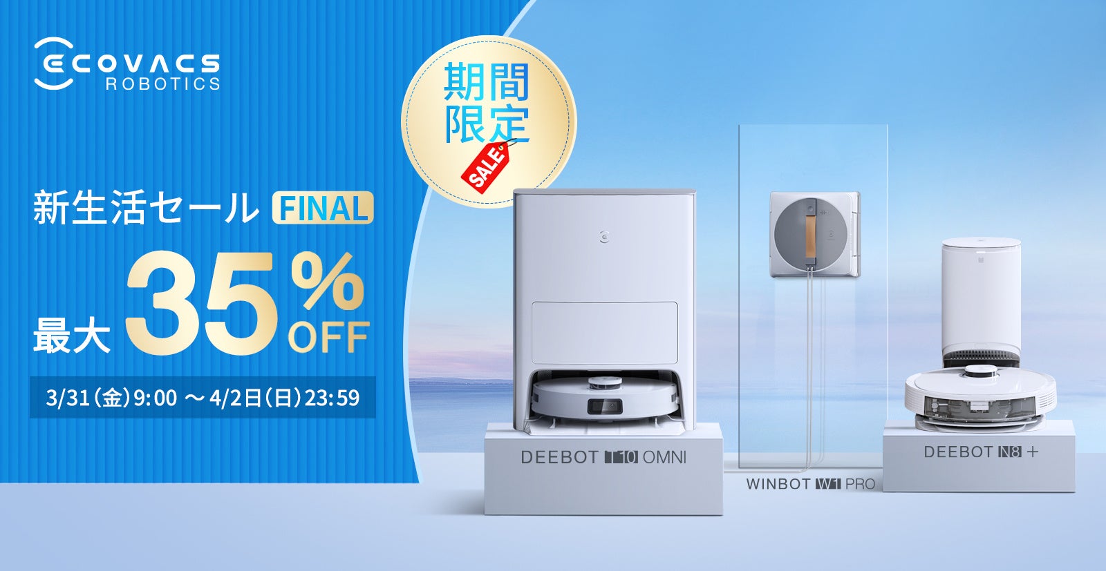ロボットの研究開発、生産、販売を一体化した家庭用ロボットの総合メーカー・エコバックスジャパン株式会社(東京都品川区/代表取締役社長 坂梨文康)は、3月31日(金)9:00から4月2日(日)23:59までAmazon.co.jpで開催される「新生活セールFINAL」に参加、人気製品が最大35%OFFとなる特別セールを実施いたします。