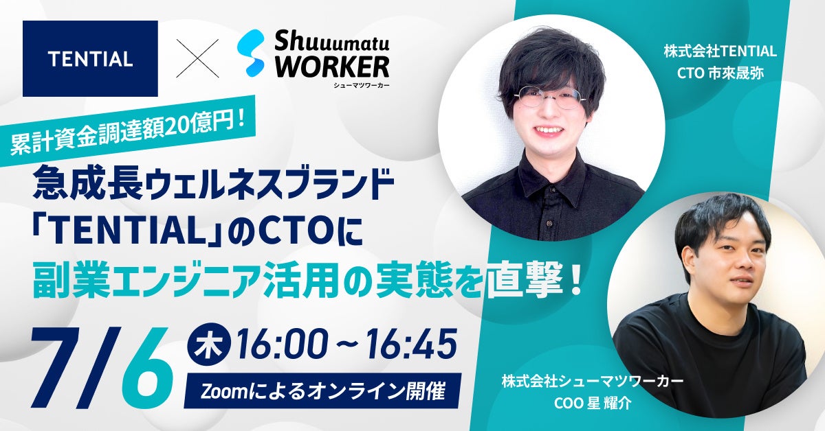 今回のセミナーでは、急成長中のウェルネスブランド「TENTIAL」を運営する 株式会社TENTIALでCTOを務める市來晟弥様に、採用難が続くエンジニアの採用法や副業エンジニアの活用術をお伺いします。