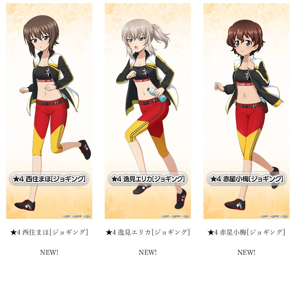 2月1日(火)13時から開始する2月日替わりイベントでは、ジョギング姿の西住まほ、逸見エリカ、赤星小梅が新生徒として登場いたします。ぜひご確認ください。