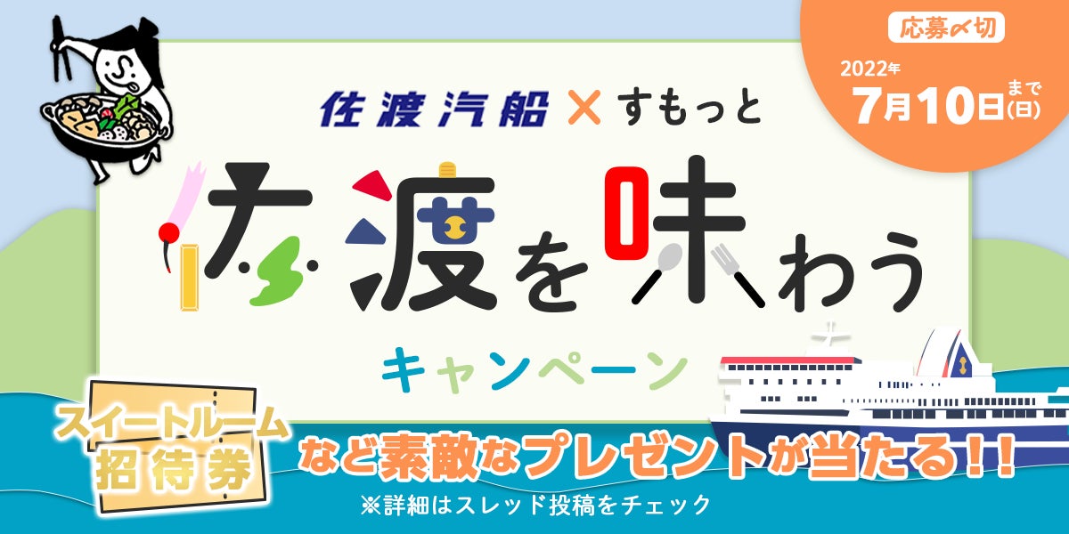 Twitterで「佐渡汽船×すもっと 佐渡を味わうキャンペーン」を実施。「すもっと」の佐渡旅のお土産として抽選で、佐渡汽船カーフェリーのスイートルーム片道乗船ご招待券など素敵な景品をご用意。