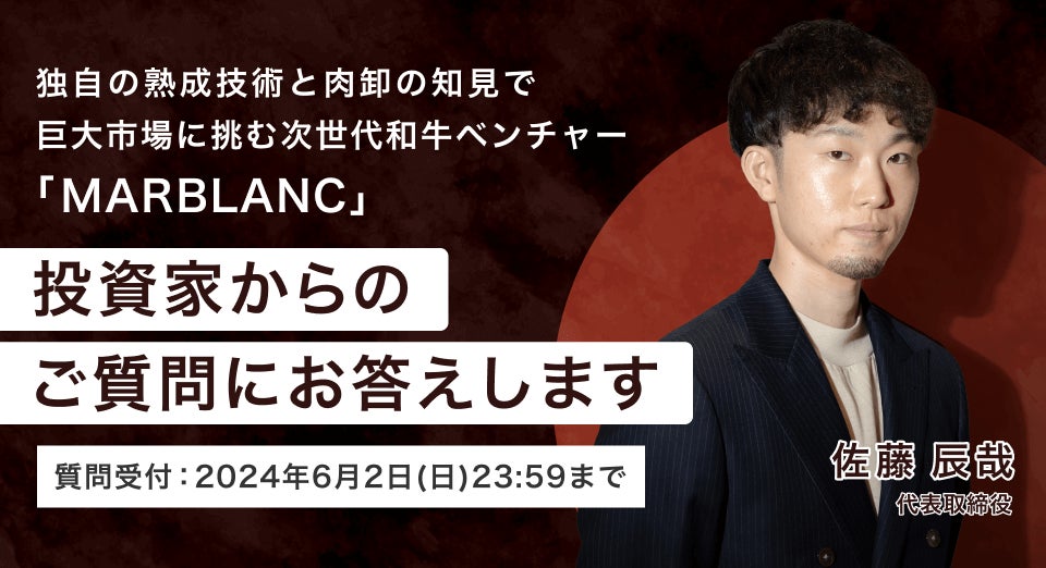 2024年6月2日(日)23:59まで、投資家のみなさまより「MARBLANC」へのご質問を受け付けます。 投資家の皆さまからいただいたご質問への回答を、2024年6月4日(火)を目途に募集ページ( https://ecrowd.co.jp/projects/37 )へ掲載する予定です。