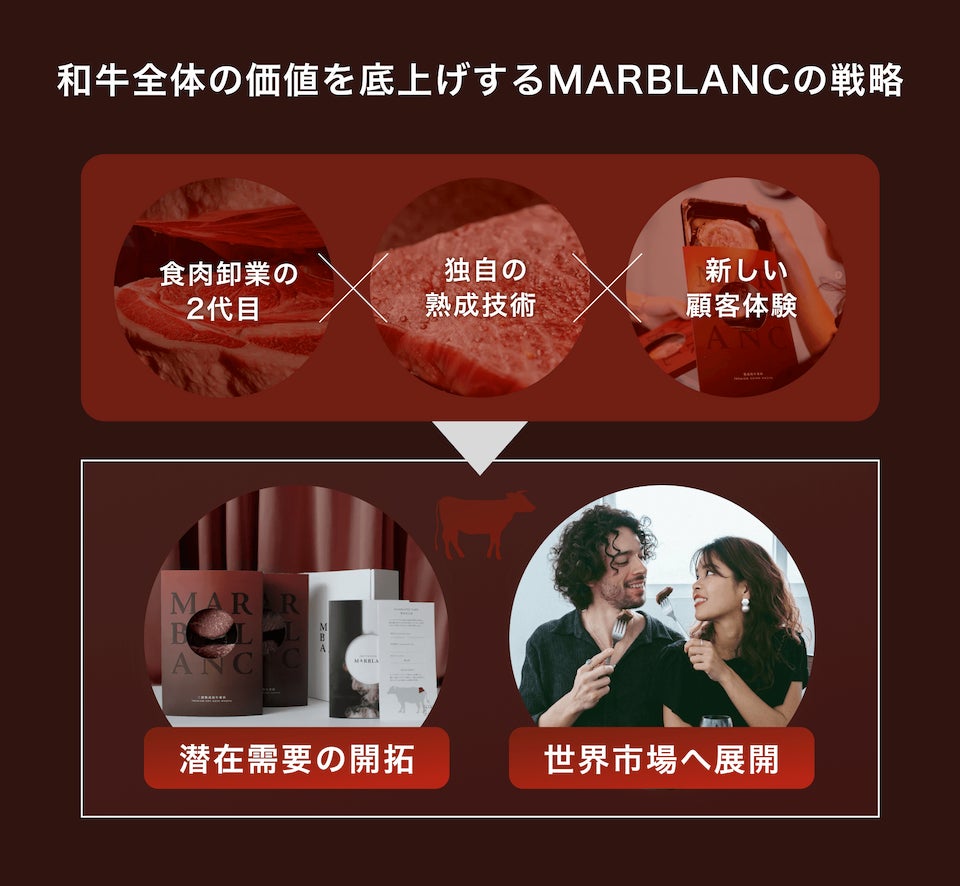 MARBLANCは、産地に依らない高品質な和牛肉を家業の食肉卸売から低コストで確保し、独自の熟成技術などを用いて価値を高めることで、業界の課題に挑みます。和牛を評価する新しい価値観を創出することで和牛全体の価値を底上げし、国内の潜在需要の開拓と、「WAGYU」の価値がさらに高まる世界への展開も目指します。