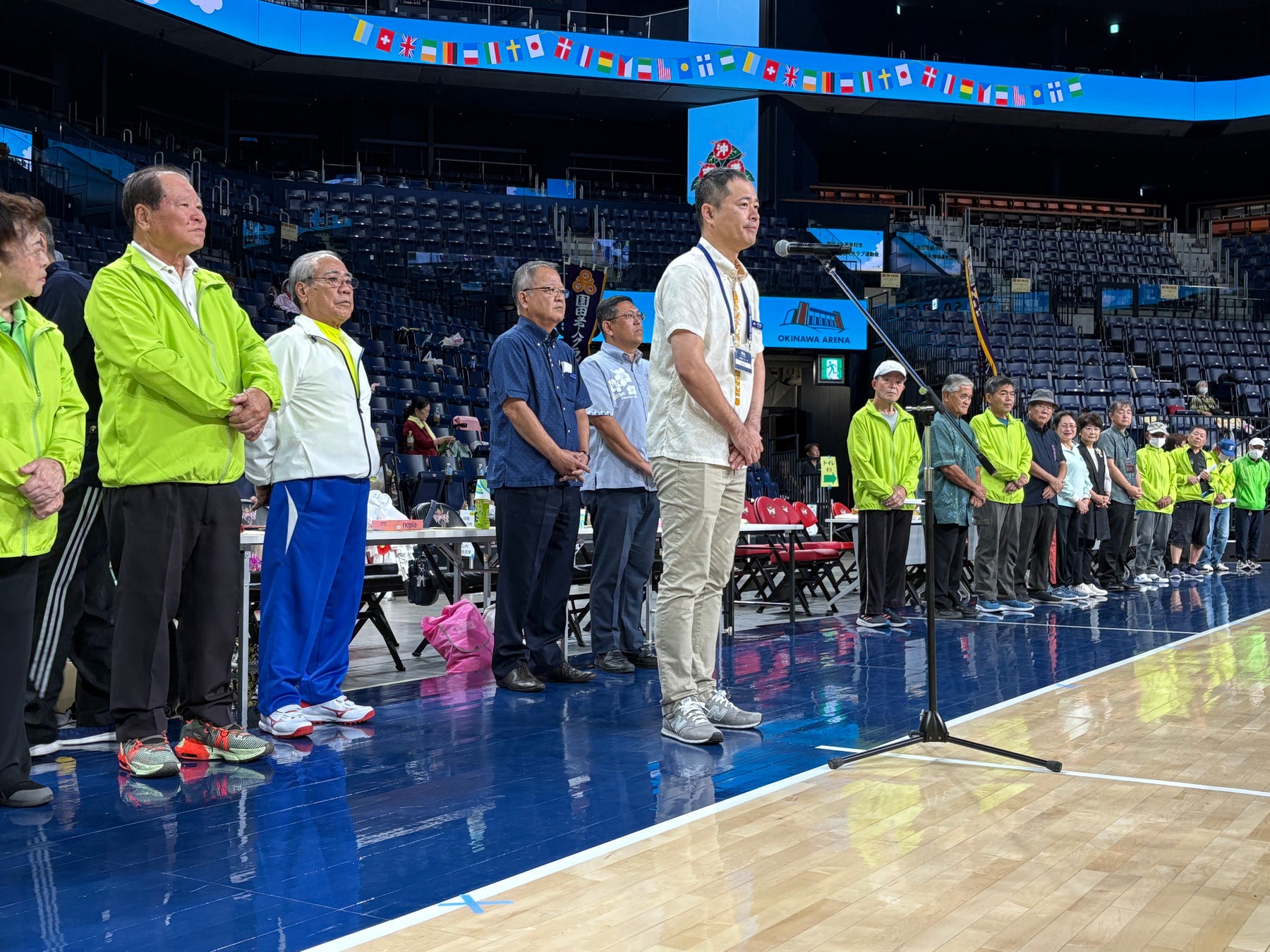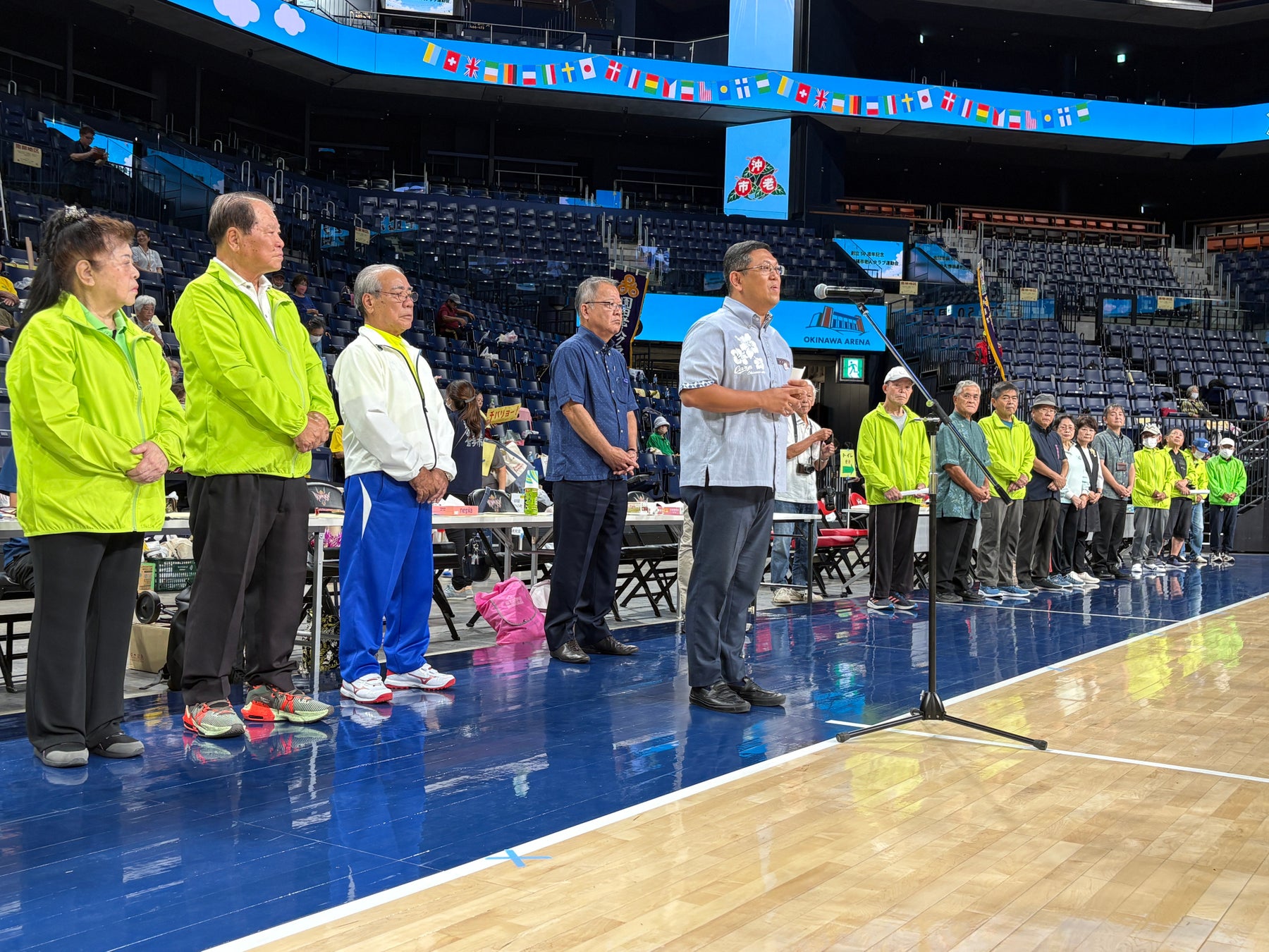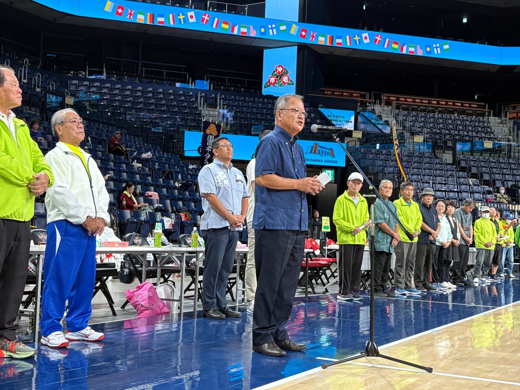 当日は、沖縄市老人クラブ連合会の新里八十秀会長の挨拶をはじめ、共催者として、沖縄アリーナ株式会社の片野竜三取締役が挨拶を行いました。また、大会の祝辞では、来賓の沖縄市副市長の平田嗣巳様並びに沖縄市副議長の藤山勇一様からの挨拶をいただき開会いたしました。