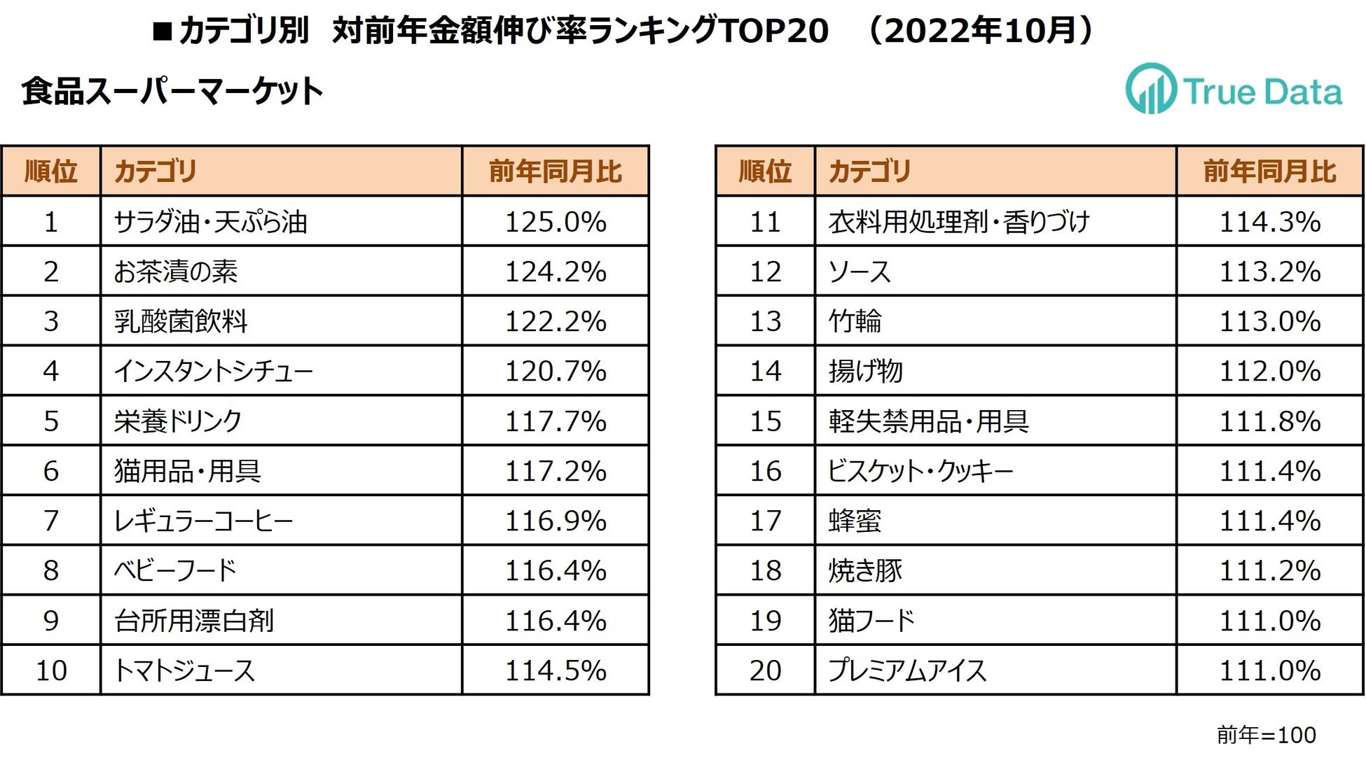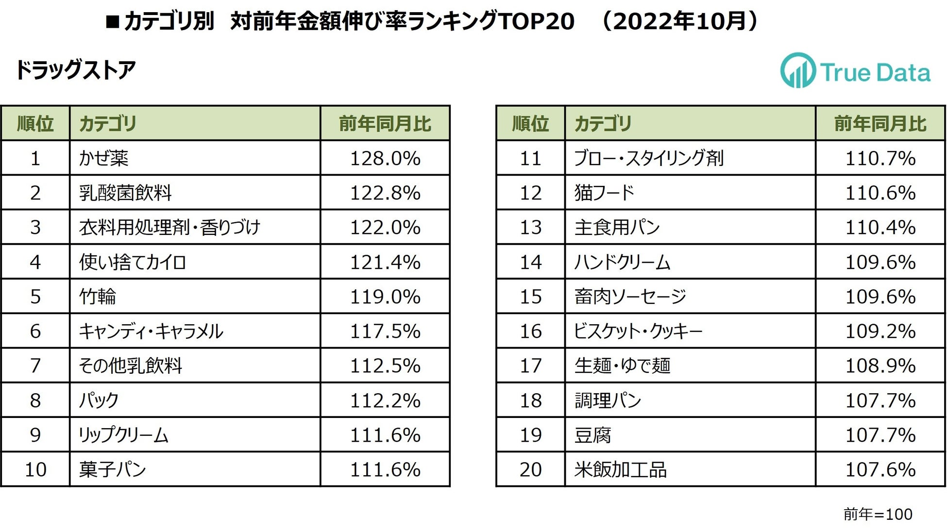 ~ドラッグストア、食品スーパーマーケット 2022年10月の対前年伸び率TOP20カテゴリを発表 ~