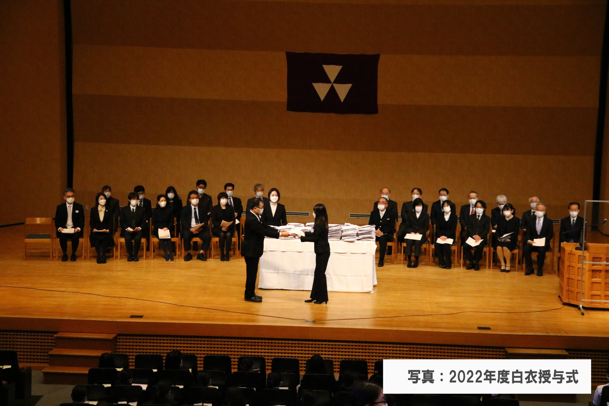 本学学生としての自覚と責任を持って実習に臨んでほしい、という願いを込めて、授与する白衣には学生の名前を刺繍しました。式典は礼拝形式で行われ、ひとりひとりに白衣を手渡しします。本式典を通して、知識や技能のみならず、命と健康を守る使命感、責任感、倫理観を身につけ、プロフェッショナルの卵としての自覚を新たにできるよう、取り組んでいます。