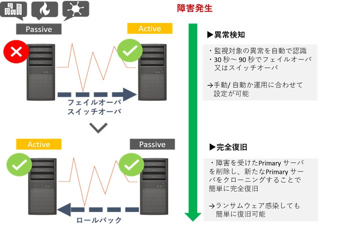 Continuity Engineは、サイバー攻撃や自然災害などによりシステム障害が生じても、ダウンタイム(システムが使用できなくなる時間)を限りなくゼロにすることで、ビジネスを安全に運用継続させるBCP・DR(災害復旧)対策の高可用性クローニング(*)ソリューションです。