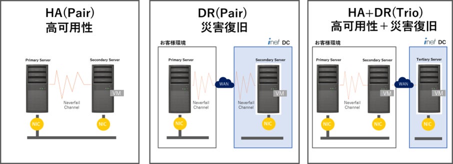 DR(災害復旧)もしくはHA+DR(高可用性+災害復旧)構成の場合、アイネットデータセンター(以下、DC)にクローンデータの保管環境を構築することが可能です。堅牢なDCで、お客様の大切なデータを保護し、障害時にもビジネスの運用継続を実現させます。