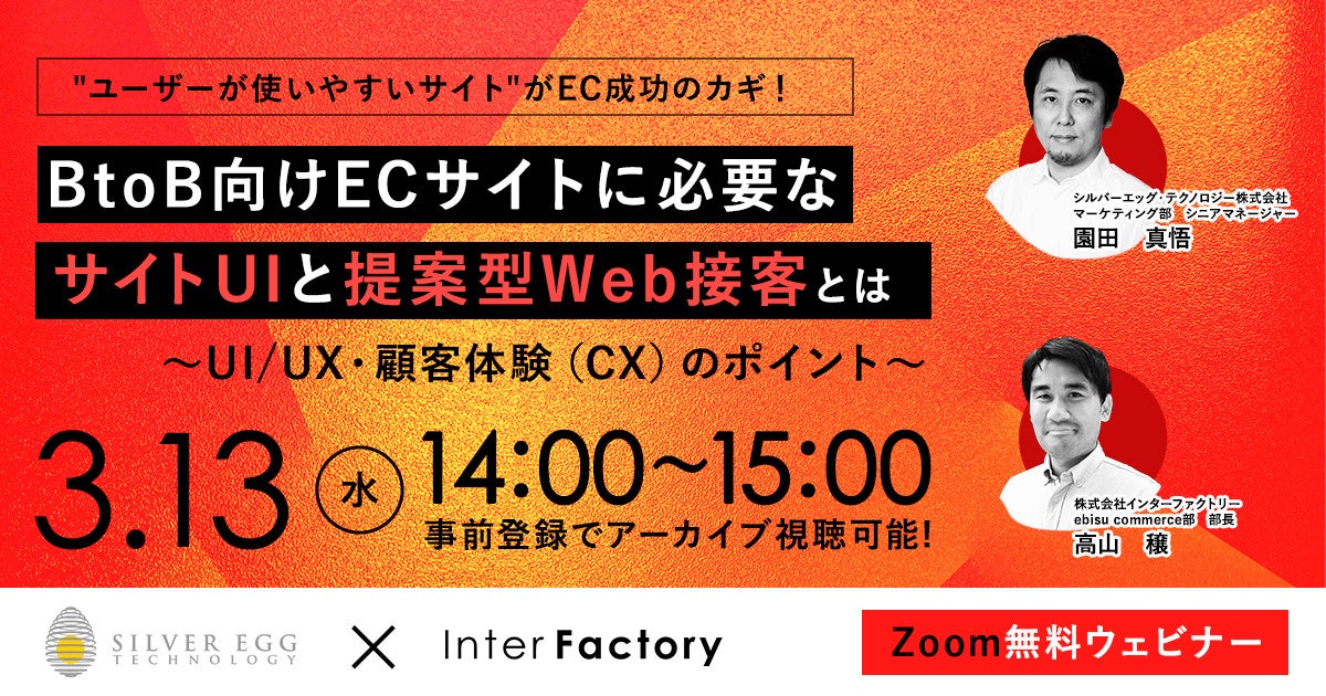 AI技術をベースとしたデジタルマーケティングサービスを提供するシルバーエッグ・テクノロジー株式会社(本社:大阪府吹田市、代表取締役社長&CEO:トーマス・フォーリー、証券コード 3961、以下 シルバーエッグ社)は、2024年3月13日(水)に、クラウドコマースプラットフォーム事業を展開する株式会社インターファクトリー(本社:東京都千代田区、代表取締役社長 兼 CEO:蕪木 登、以下 インターファクトリー社)と共同で、ウェビナー「“ユーザーが使いやすいサイト”がEC成功のカギ! BtoB向けECサイトに必要なサイトUIと提案型Web接客とは ~UI/UX・顧客体験(CX)のポイント~」を開催いたします。
