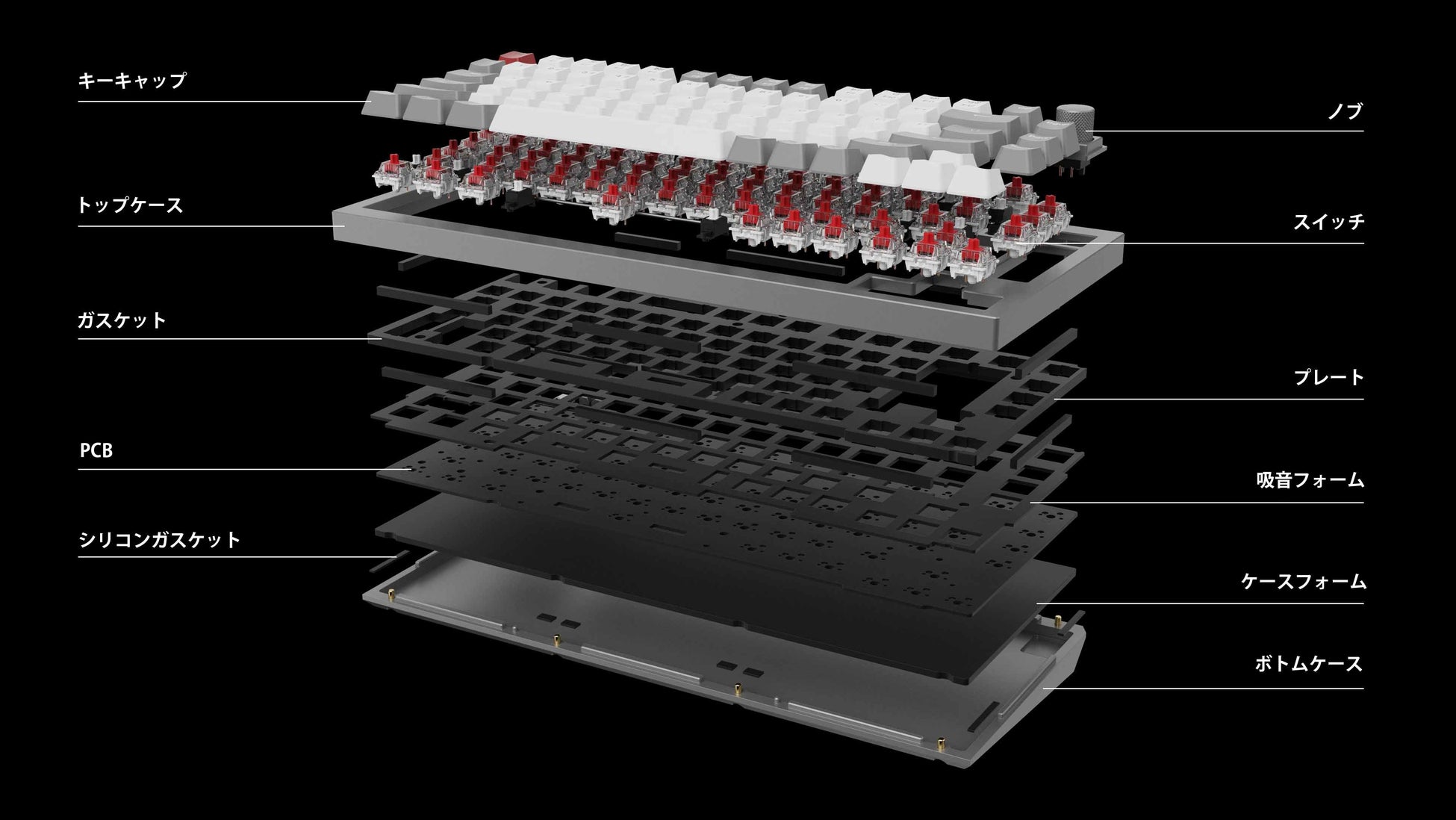 ダブルガスケット設計は、業界における革新的な構造と言えるでしょう。プレート上のガスケットに加え、トップケースとボトムケースの間にシリコンパッドを追加しました。金属間の共振を大幅に低減し、この結果、衝撃を受けた金属のノイズを低減することができます。このダブルガスケット構造により、ガスケット構造の柔軟性を維持したまま、キーボード全体の打鍵音を良くすることができます。
