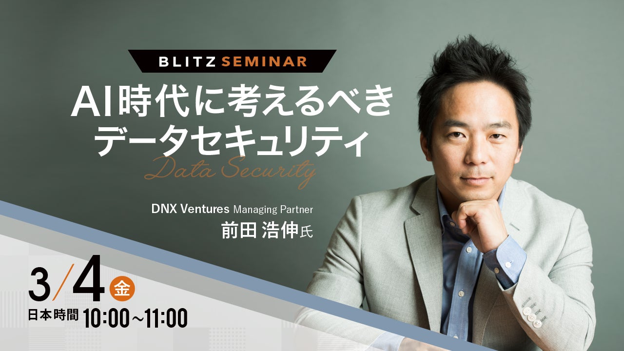 TECHBLITZ主催のオンラインセミナーシリーズ「BLITZ SEMINAR」。今回はDNX Ventures Managing Partnerの前田 浩伸 氏をお招きし、今変わりつつあるデータセキュリティの考え方についてお話しいただきます。