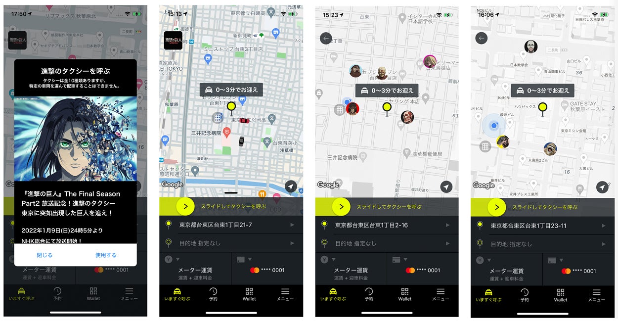 走行期間中は、タクシーアプリ「S.RIDE」で『進撃のタクシー』の指定配車が可能です。S.RIDEでの配車範囲は、東京都23区内となります。
