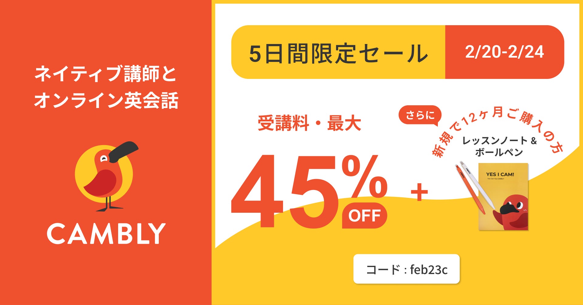Cambly Inc.(本社:アメリカ・サンフランシスコ、日本代表:佐藤 亜希子)が提供するネイティブ講師とのオンライン英会話サービス「CAMBLY(キャンブリー)」は、2月20日(月)から2月24日(金)までの5日間、英会話レッスンが最大45%オフでご利用いただけるセールを開催いたします。また新規で12ヶ月コースをご利用の方には、もれなくCamblyオリジナル文具をプレゼントいたします。