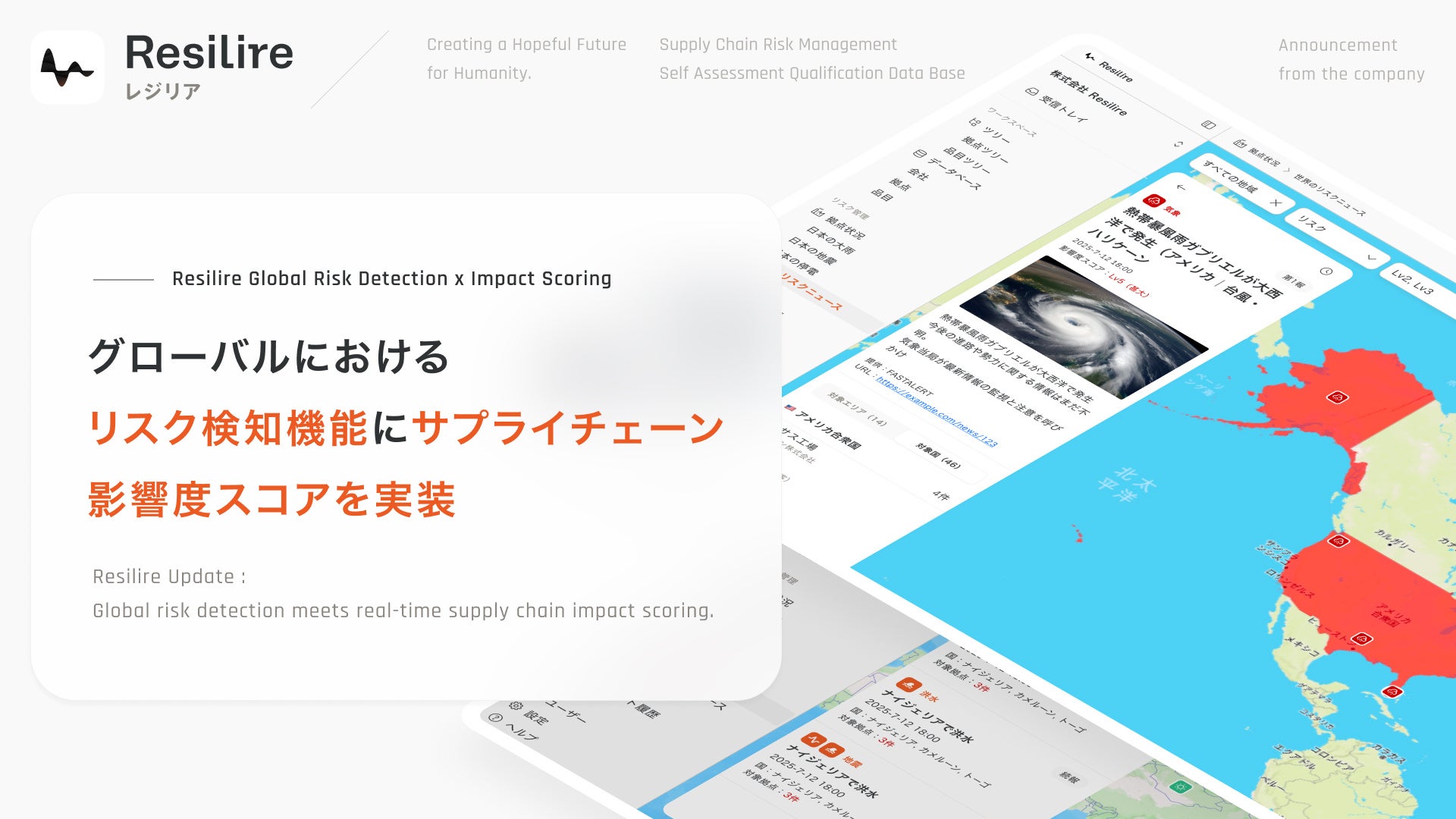 株式会社Resilire(本社:東京都港区、代表取締役:津田 裕大、以下「レジリア」)は、海外のリスク検知機能を大幅に強化し、世界各地で発生するリスク情報に対するサプライチェーン影響度スコアによる評価機能をリリースいたしました。