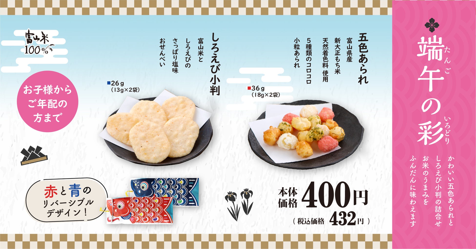 端午の彩は、お子さまが食べやすい人気の薄焼きせんべい「しろえび小判」と5種類の様々な味わいが楽しめる「五色あられ」の2種類の商品が入っています。