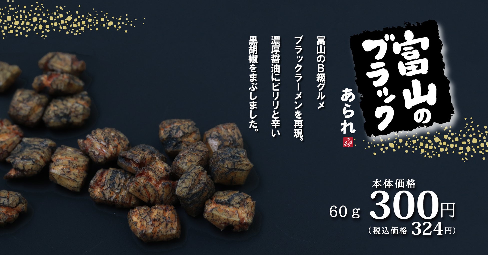 ブラックラーメンを再現した濃厚醤油とピリリと辛い黒胡椒をまぶした濃厚な味付けがクセになるあられです。ビールや冷たいドリンクが進む、新しいおやつ商品です。