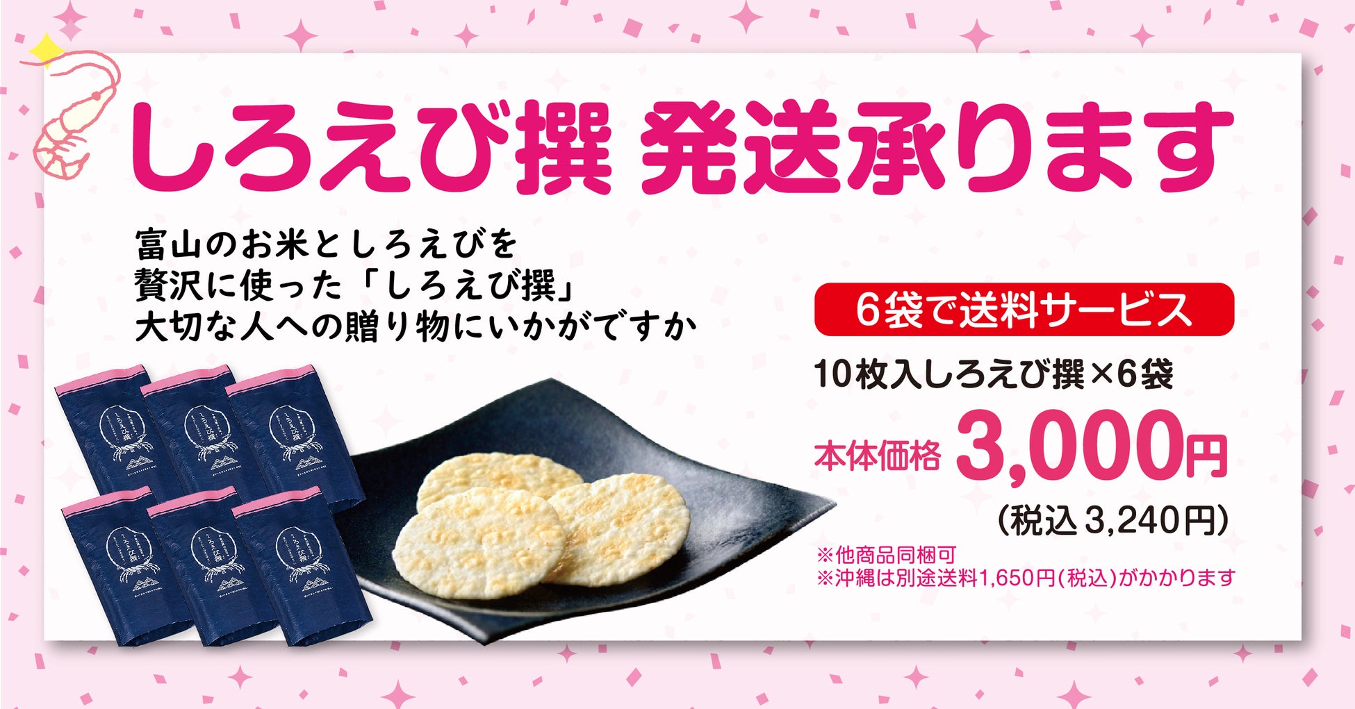 観光でのご旅行や富山県内へのご帰省でのご来店のお客様からは、「居住地の自宅まで購入品を送ってほしい」というご要望を毎年多くいただきます。ささら屋では、人気商品「10枚入しろえび撰」を6袋まとめ買いいただいた方に期間限定で送料無料でお送りいたします。「10枚入しろえび撰 6袋」をご購入いただいた方は、同一住所であれば他のご購入商品も同梱して送付できますので、お土産のまとめ買いなどをご検討の方はぜひご利用ください。