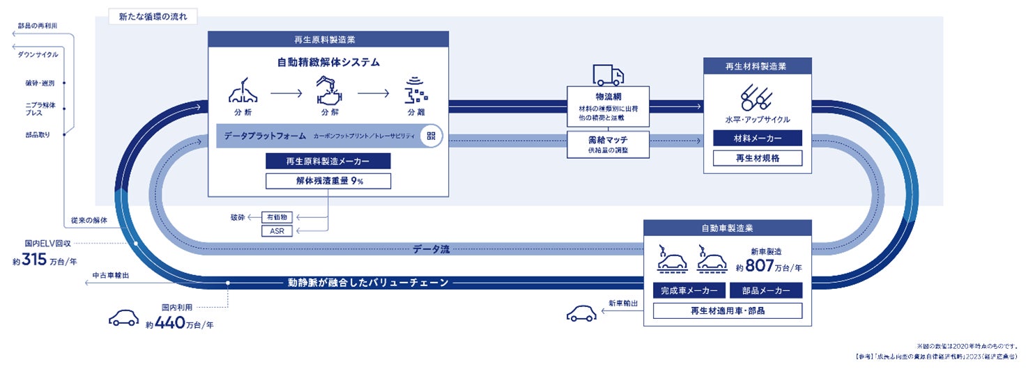 今回設立したBlueRebirth協議会は、これらの課題に挑戦し、2035年に向けて自動車リサイクル産業を、自動車産業における資源循環型の新たなバリューチェーンの一翼を担う「再生原料製造業」へと進化させ、Car to Carの実現を目指します。具体的な取り組みとしては、動静脈が融合したバリューチェーンの構築に向けて、ELVの自動精緻解体を起点に、参画企業や研究機関などと議論や調査を行い、技術開発や実証実験を重ねるとともに、関係企業や団体への提言なども進めていきます。