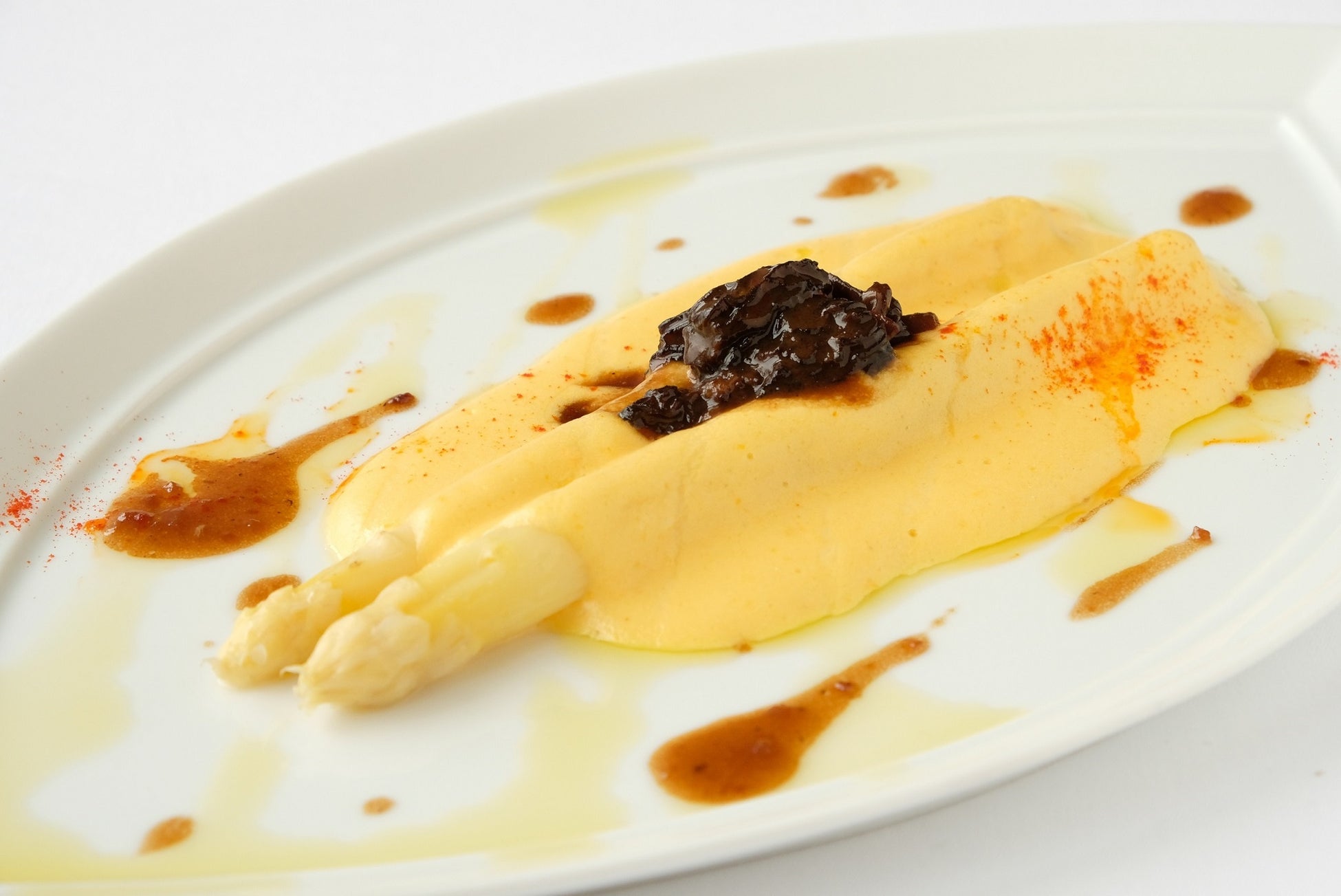 程よい食感を残しながら絶妙に茹で上げたフランス産・ホワイトアスパラガスに、卵黄とバターで作るオランデーズソースをたっぷりとかけてお召し上がりください。オランデーズソースの上にはさらに旬のモリーユ茸とその出汁のソースを添え、味に旨みと奥行きを加えました。ホワイトアスパラガスと相性のよい「卵」を使ったソースでいただく王道スタイルで、一番おいしい旬のホワイトアスパラガスをお楽しみいただけます。