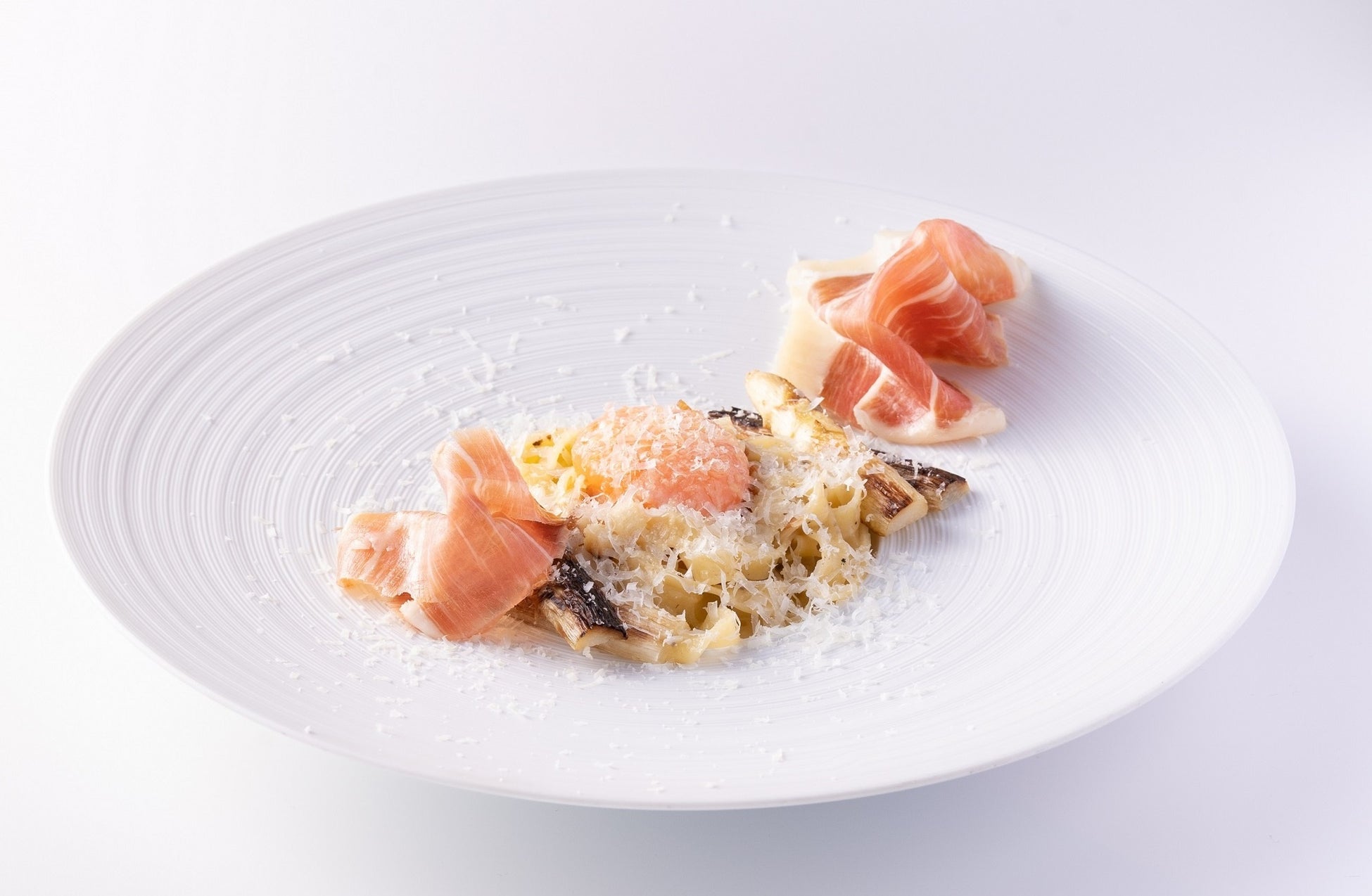 黒胡椒を練り込んだ自家製のタリアテッレ(幅広の平打ちパスタ)を、新鮮な大阪の地卵とペコリーノチーズ、グァンチャーレ(豚ほほ肉の塩漬け)のソースでからめてカルボナーラに。主役となるのは、炭火で焼いて甘みを引き出したホワイトアスパラガス。炭火の香ばしさと、食感の瑞々しさが両立する絶妙な火入れで仕上げました。目の前でスライスした原木生ハムとともにお召し上がりください。