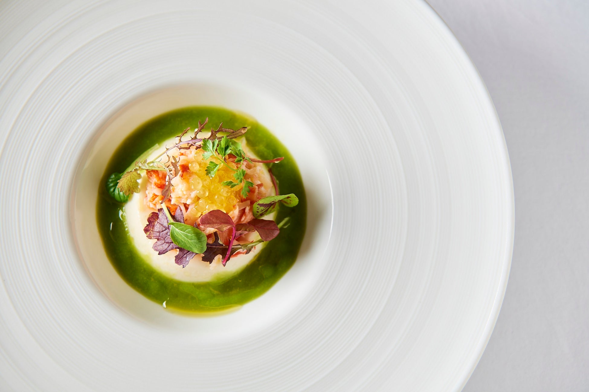 グリーンアスパラガスのピュレ トラウトキャビアを添えて」(コース料理の前菜としてご提供)