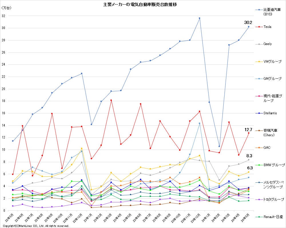 BYDが前月から2.2万台増の30.2万台で首位を維持。2位のTeslaは前月から3.6万台増の12.7万台となった。3位はGeelyで前月から0.7万台増の8.3万台。4位のVWグループは0.6万台増で6.3万台。GMグループは前月から0.3万台増の5.4万台で5位だった。
