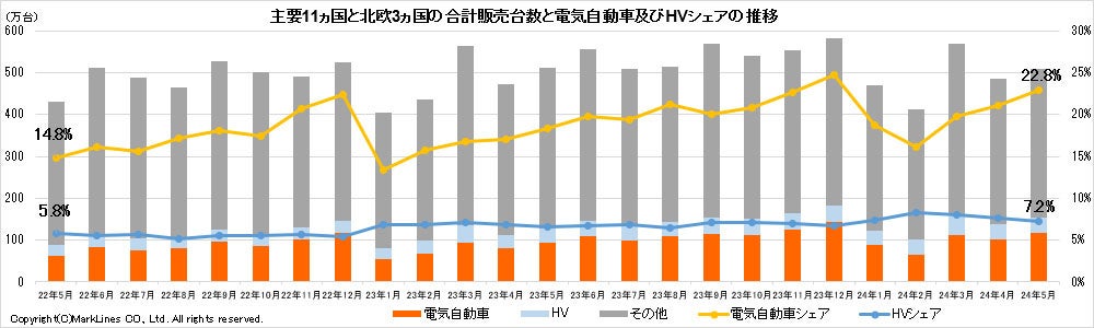 主要12カ国とノルウェー、スウェーデン、フィンランドの北欧3カ国(計15カ国)における5月の電気自動車販売台数は116.4万台だった。前年同月比で24.6%増加し、前月比でも13.8%増となった。5月の電気自動車シェアは22.8%で、前月から1.8ポイント増加した。1~5月の電気自動車の累計販売台数は、前年同期比24.2%増の485.8万台となり、自動車販売台数全体に占めるシェアは19.9%だった。
