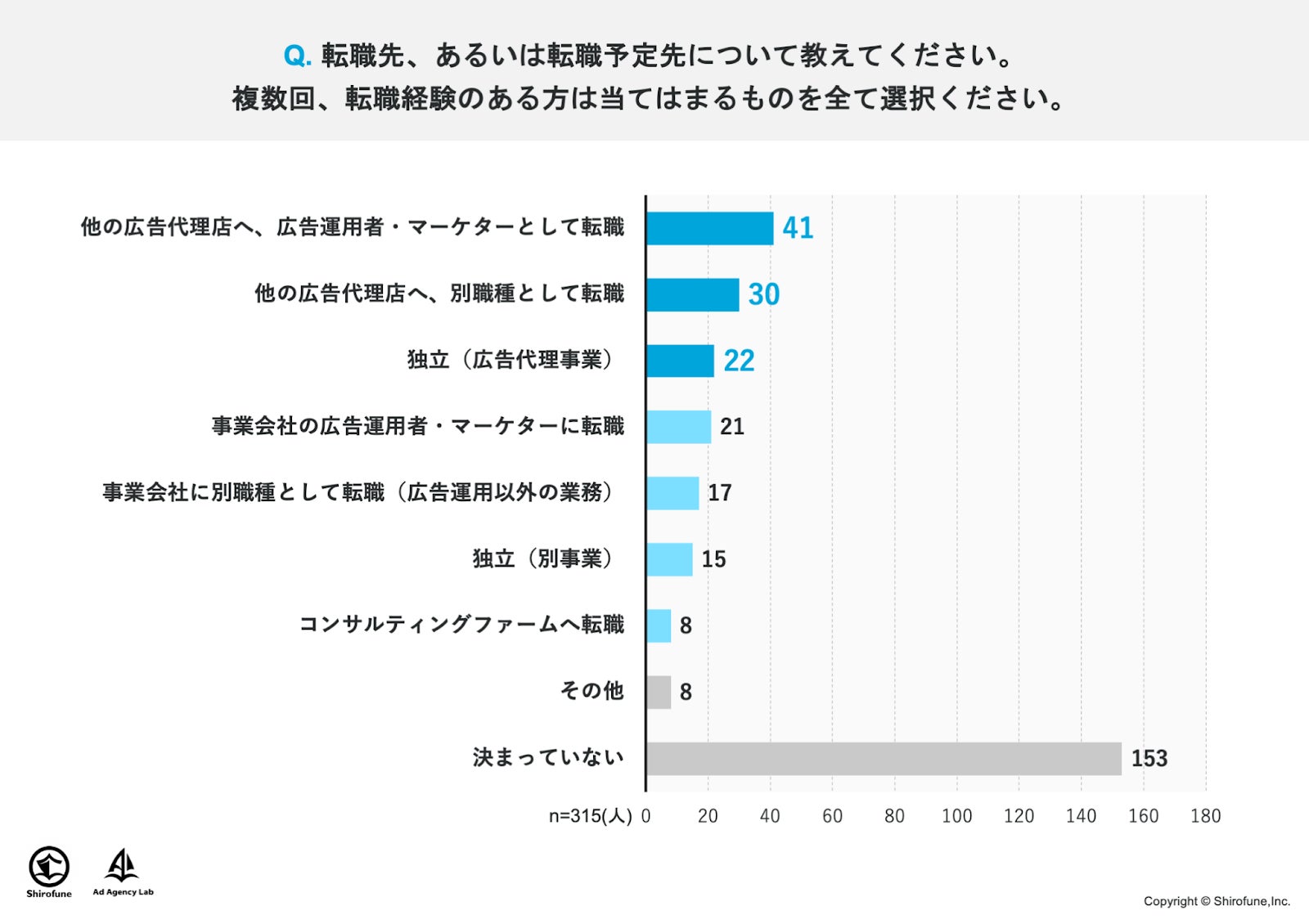 - 転職先の傾向として、同業種である広告代理店の同職種が多い傾向に。