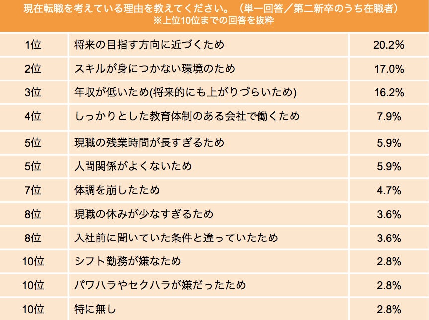 - 第二新卒のうち在職者が現在転職を考えている理由として、5人に1人が「将来の目指す方向に近づくため」と回答。「スキルが身につかない」「年収が低い」が続く。