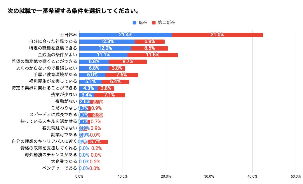 - 次の就職で一番希望する条件は「土日休み」が最多。次の「金銭面の条件が良い」との差は二倍に。