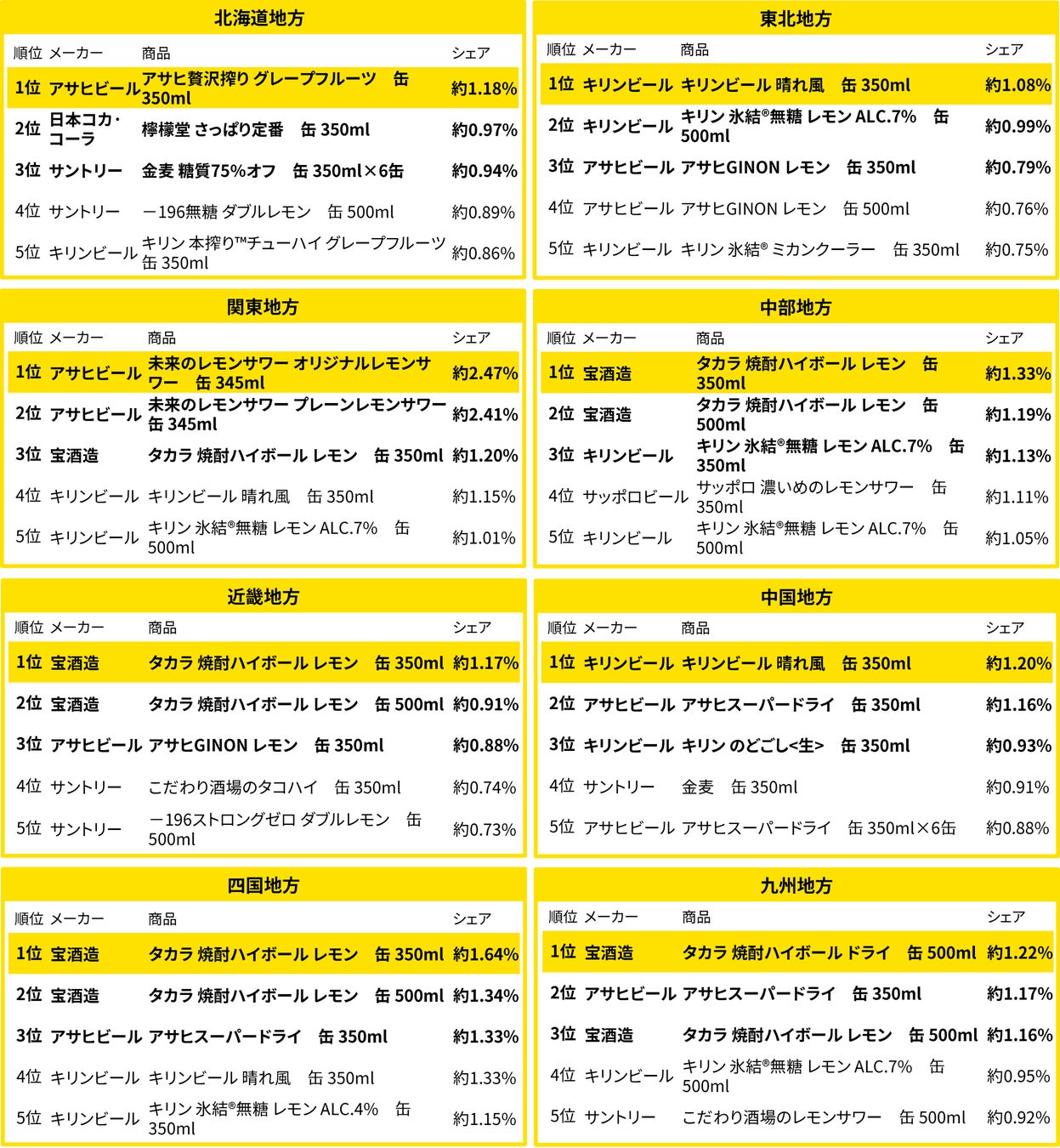 全国ランキングでは、「焼酎ベースの炭酸割り」が「ビール」を抑えて1位を獲得しました。5位には「ジンベースの炭酸割り」、6位、7位、8位には「ウォッカベースの炭酸割り」がランクインし、レモン味の人気が高いことが分かりました。また、「ビール」 は2位、4位、9位にランクインしました。