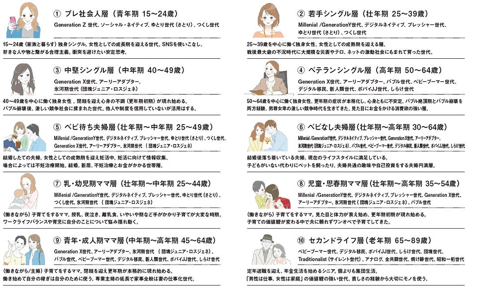 ライフコース(職業・家族構成を加味した人生コース)と ライフステージ(年齢・年代という人生の立ち位置)の交点における特徴的な集合体(クラスター)を象徴化しています。