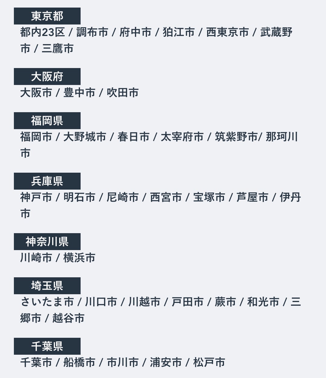 サービス展開エリアについては、所在地や間取りの大きさに関係なく一律料金でご依頼可能で追加の交通費や移動費などの費用負担はありません。今後もサービス提供エリアを拡大予定です。