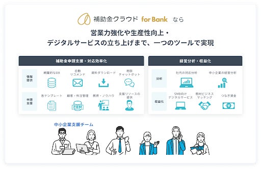 「補助金クラウド」では、今回の「ダッシュボード機能」のリリースを皮切りに、補助金支援を軸としつつ、営業店での中小企業支援のDX、金融機関本部と営業店のコミニケーションのDX、金融機関とビジネスマッチング先のコミニケーションのDXを推し進めていきます。