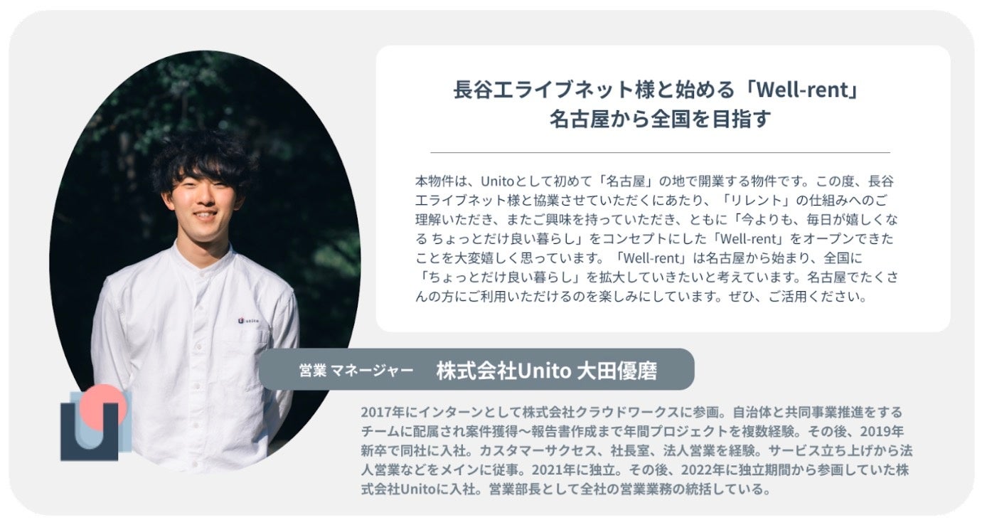 株式会社Unito(本社:東京都千代田区、代表取締役:近藤佑太朗、以下「Unito」)は、2023年5月29日(月)愛知県名古屋市に、株式会社長谷工ライブネット(本社:東京都港区、代表取締役社長:松田隆幸、以下「長谷工ライブネット」)との共同事業である「Well - rent 名古屋丸の内(ウェルレント ナゴヤマルノウチ)」(以下「本物件」)をオープンし、同時に入居者の募集を開始しました。