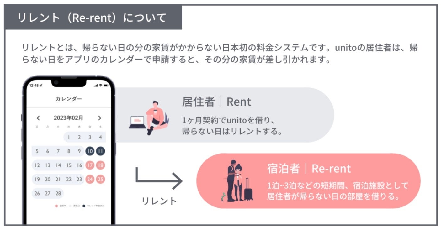 本物件は、帰らなかった日数に応じて家賃が減額される新しい家賃システム「リレント」を採用しています。入居者が、帰らない日の部屋をさらに宿泊施設として短期宿泊者に貸し出す(Re-Rent)ことで、家を使ってない日の家賃を節約することができます。