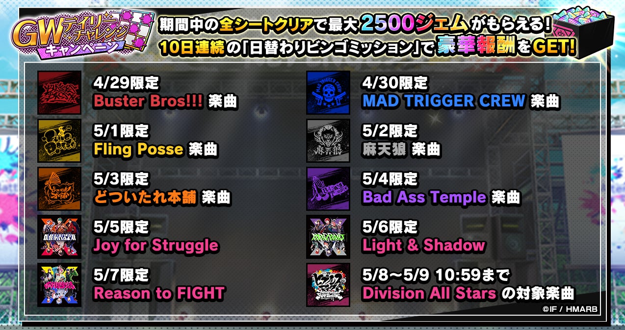 期間中、ビンゴミッションやログインボーナス、ライズ回復時間が1/2になるキャンペーンなどを開催しています。最大2500ジェムを手に入れることができます。詳細はアプリ内お知らせをご確認ください。