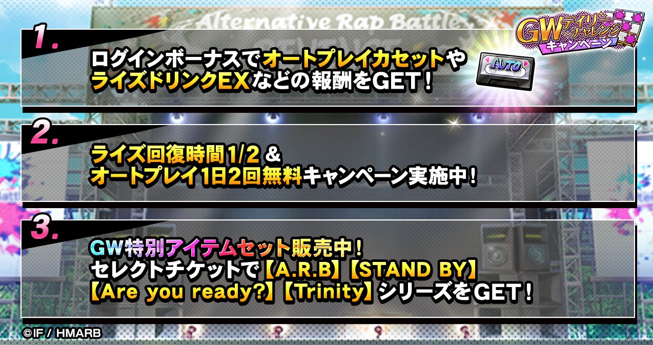 イベント開催にあわせて2022年4月29日(金)0時より「ヒプマイクエスト3rd 前編~モンサブしようぜ~ ログインボーナス」を実施いたします。期間中にアプリにログインすると、イベントが進めやすくなる「ライズドリンクEX+」「オートプレイカセット」などのアイテムを獲得することができます。